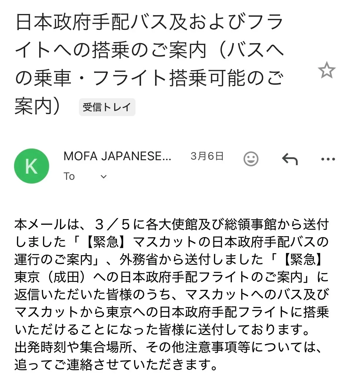 散歩から帰ってきて部屋にいると、政府から「政府手配によるバス乗車を希望された皆様へ」というメールが届いた。