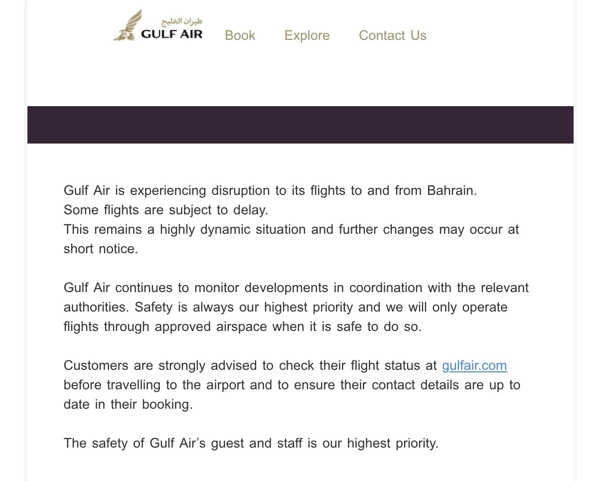 便の変更や返金処理のお知らせかと思いきや、まさに攻撃を受けていて動き得ないバーレーン発の便の遅延連絡なんて今更何を、と思い正直辟易。