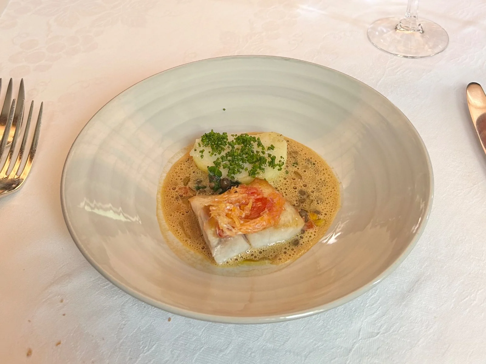 九州産カサゴのポワレ オマール海老と渡り蟹のビスク