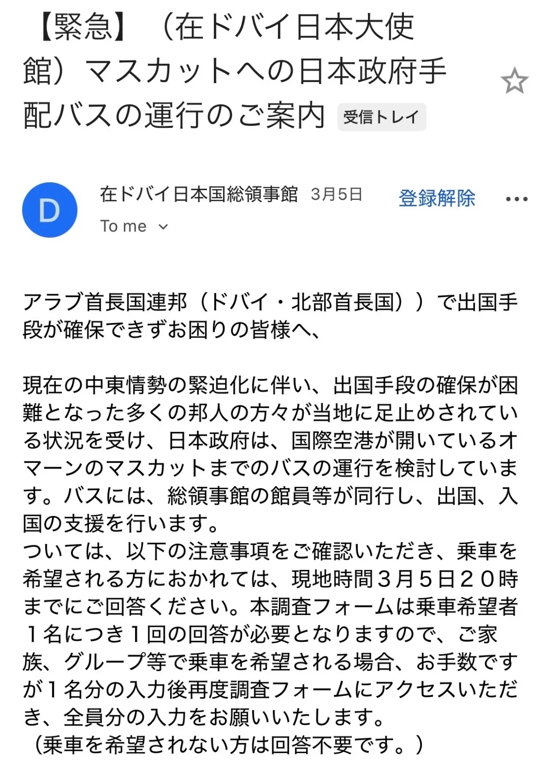 夕方ごろ、政府からオマーンのマスカット行きのバスの手配するという旨の連絡を受けた。とりあえず申請してみた。しかし、今回の第一便に乗れる人というものには条件があり私が優先されるかはわからない。